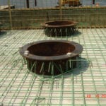 Formwork: before placing formwork, ensure the equipment is set and aligned.  If any levelling shims are to be removed upon initial setting of grout, apply a thin layer of releasing agent such as grease for easy removal.  Ensure the formwork is secure and firm as per the formwork design, maintaining the gap between formwork and the base plate. The gap should be wider on the pouring side than the opposite side.  Slant forms at a 45° angle on placing side 6mm or more from bed plate base.